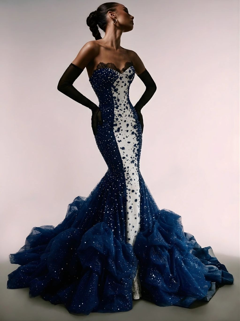 A silhouette sculpted as if the body itself were part of the cosmos.
