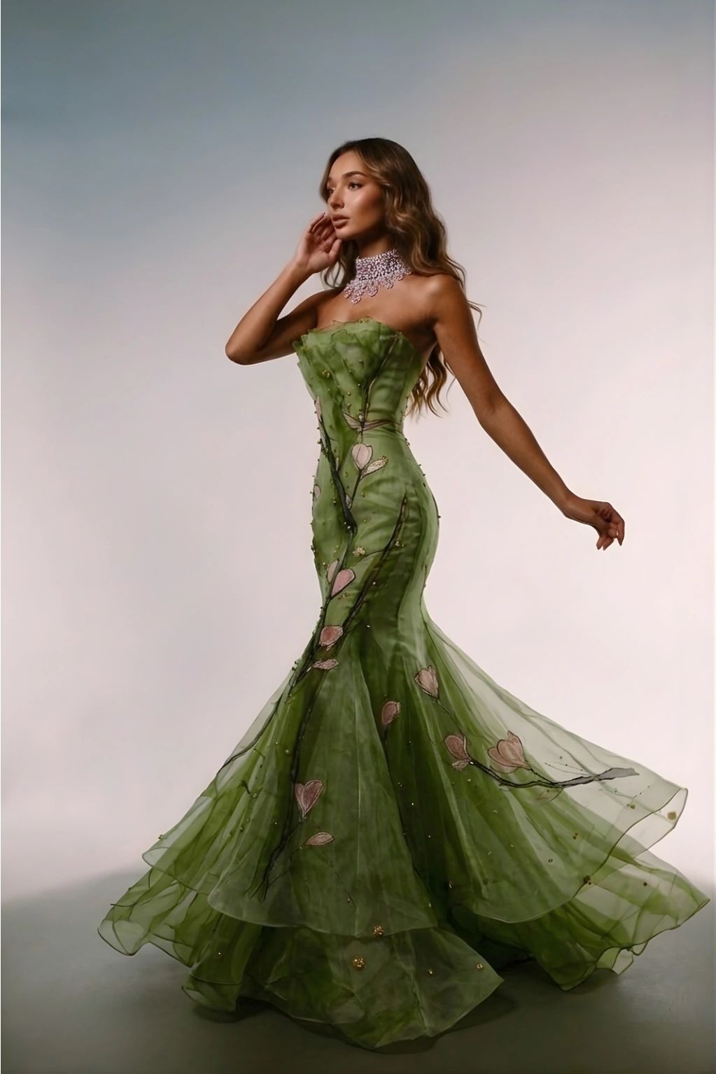 Soft layers move like fresh air through new leaves, wrapping the body in living green.