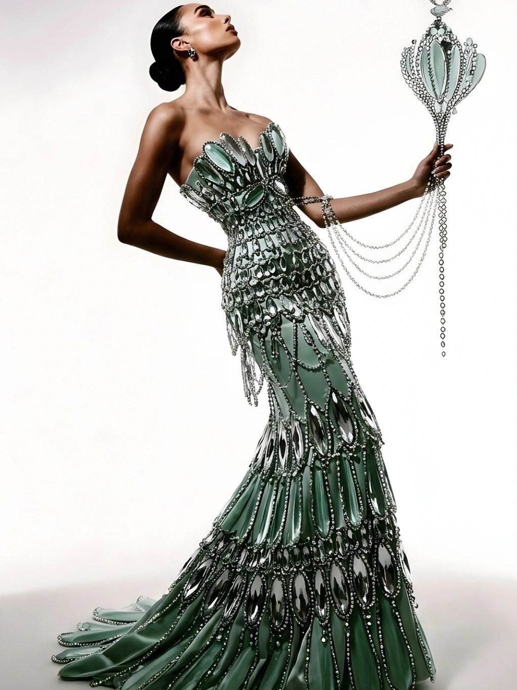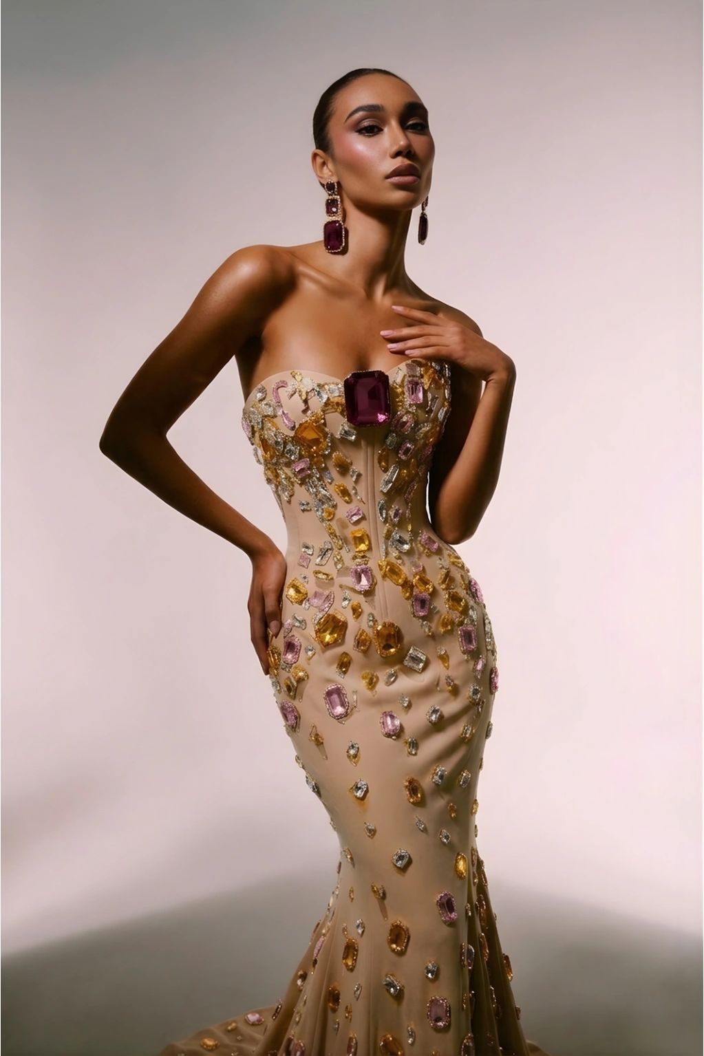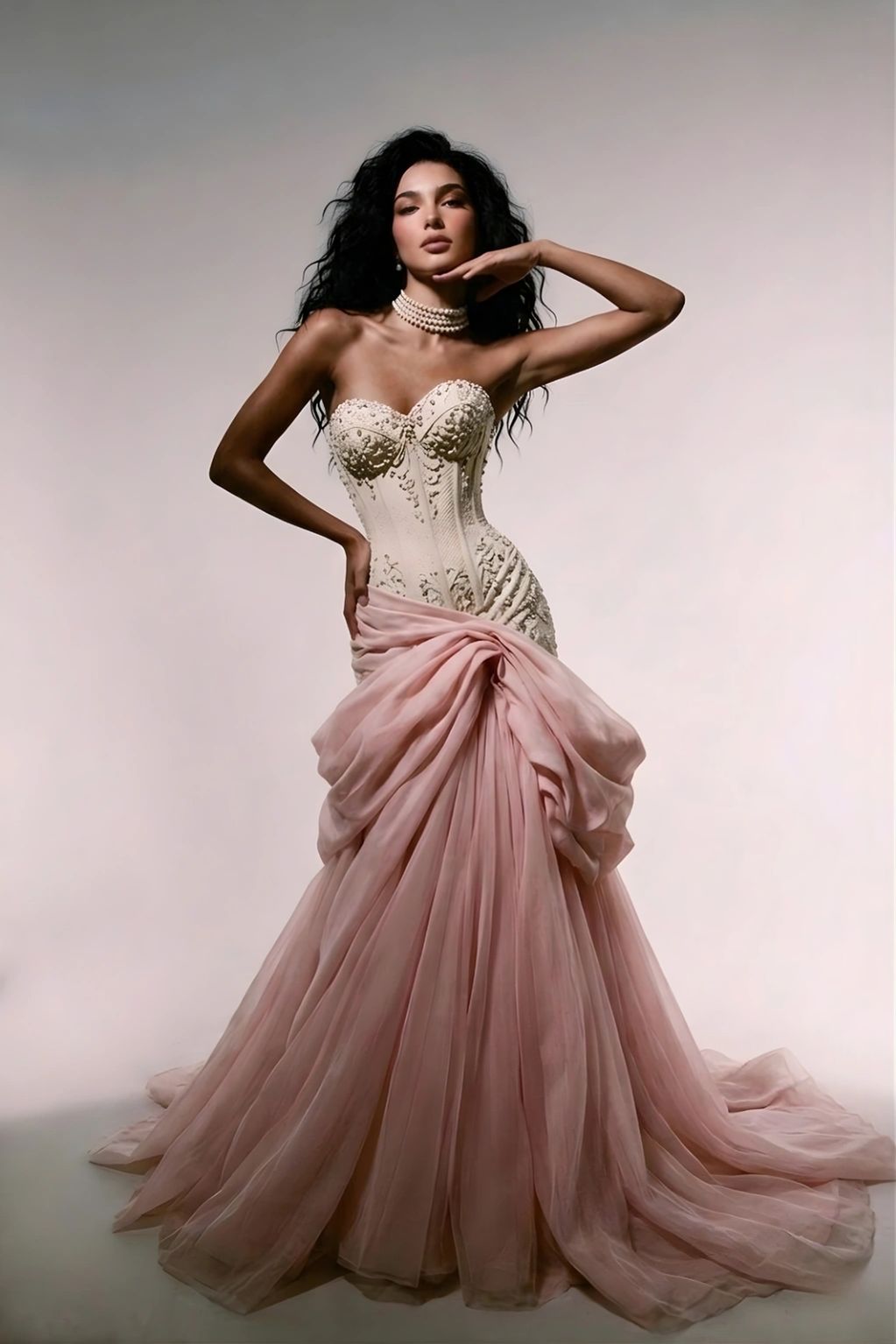 A sculpted corset meets soft flowing layers, capturing the balance between strength and grace.